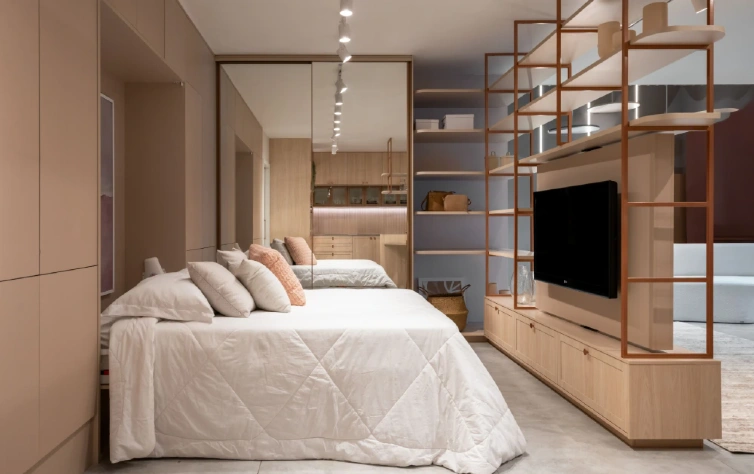 - Estúdio minimalista: um quarto pequeno pode ser em um estúdio minimalista utilizando uma paleta de cores neutras e móveis planejados. Com prateleiras flutuantes podem ser instaladas acima da mesa de trabalho para armazenamento de livros e materiais de escritório, enquanto uma mesa dobrável permite flexibilidade no uso do espaço.